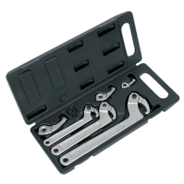 - Hook and pin interchangeable hinged arms with three wrenches covering sizes 19-120mm. Pin sizes Ø4-8mm.