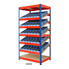 The most widely used format for medium to large items. Shelves are fitted with roller tracks or wheel lanes set at a slight downward incline (typically 3–5°) from back to front. Cartons, totes, or individual items placed at the rear roll smoothly to the front for pick. Ideal for production line supermarkets, assembly areas, and warehouse pick faces.