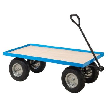The flat base design provides a stable foundation for transporting various materials with maximum versatility for different load configurations. This universal platform configuration accommodates diverse cargo types from boxed goods and components to equipment and supplies without specialized containment requirements, making these trucks truly multipurpose handling solutions.